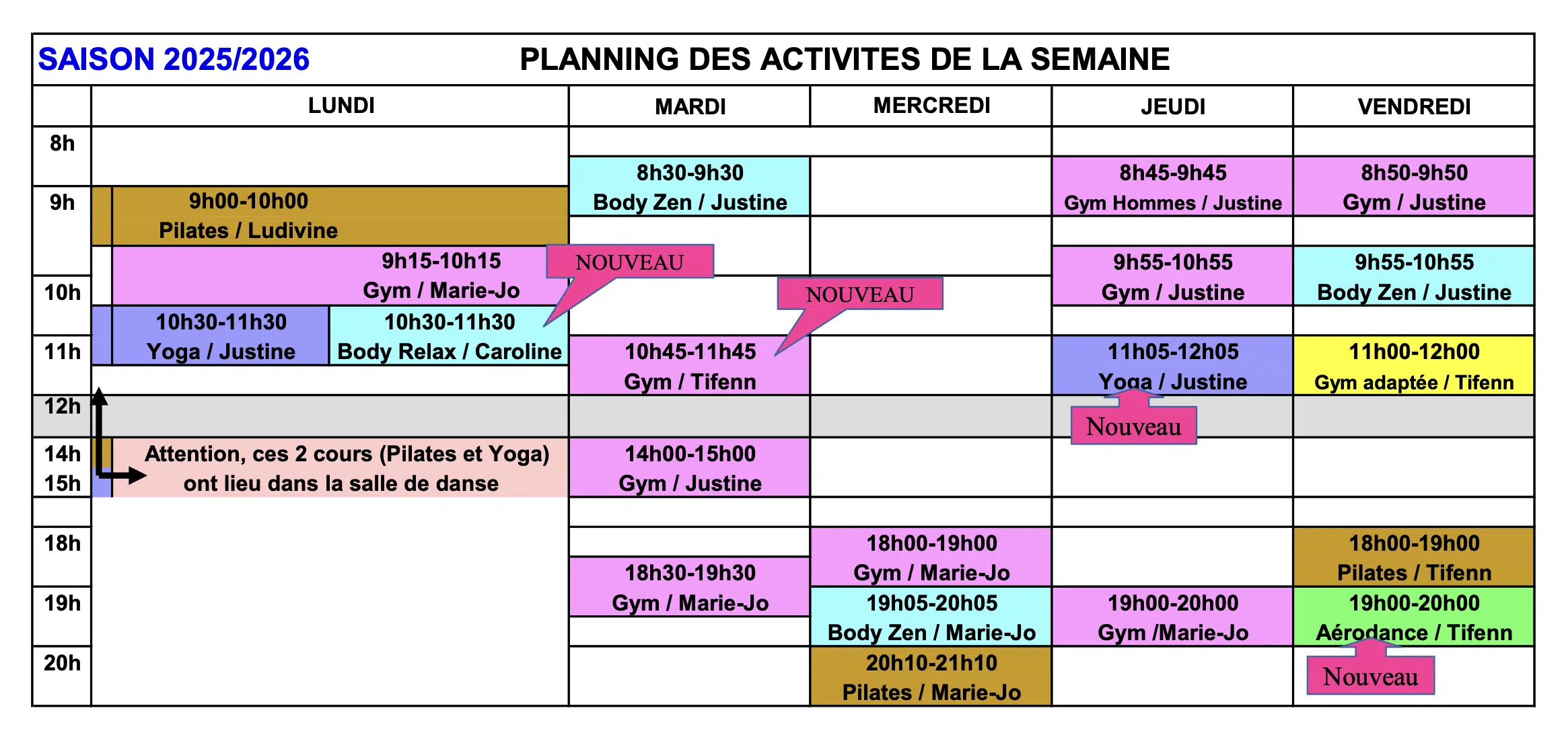 - 9 cours de gym (dont 1 cours Hommes),