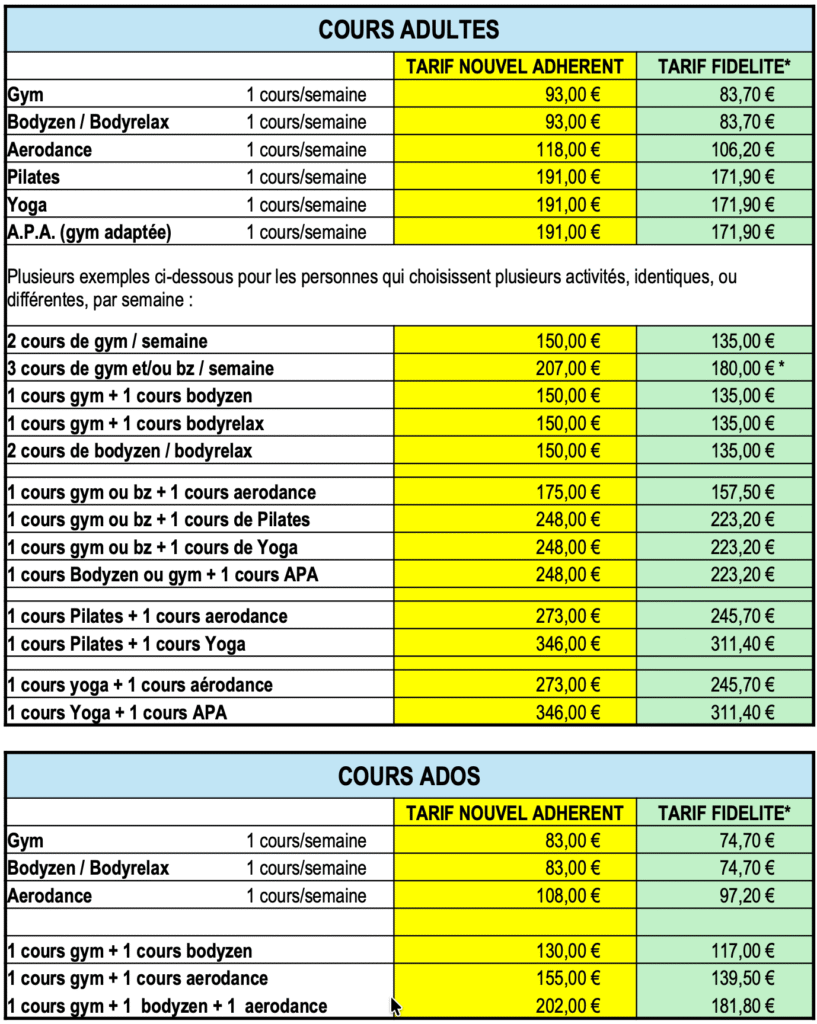 180 € * : c’est le tarif appliqué cette saison pour l’achat de 3 cours de gym et/ou bodyzen pour contenir la hausse de prix effectuée sur les tarifs de gym.